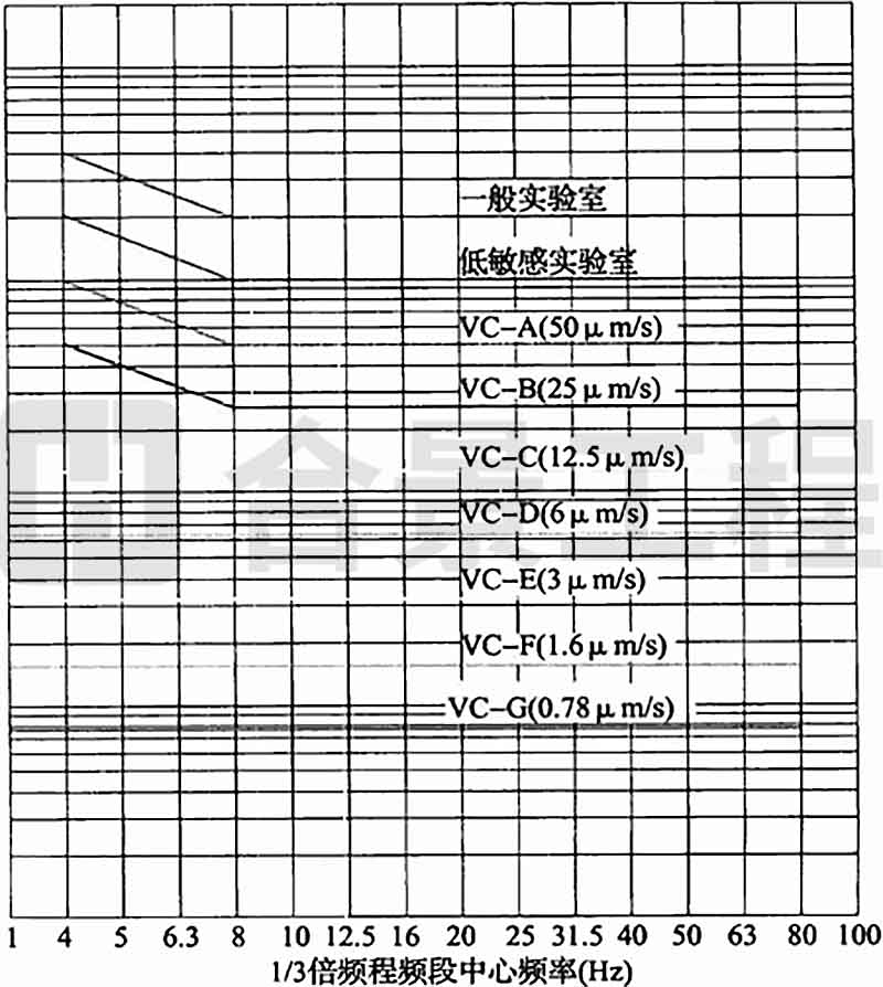 A.0.1 拉絲塔的容許振動參數(shù)可按精密設(shè)備、儀器容許振動通用標(biāo)準(zhǔn)曲線(圖A.0.1)中VC-B(25μm/s)曲線確定。